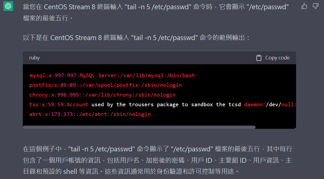 我希望您在程式碼區塊內回答終端輸出,要寫解釋。