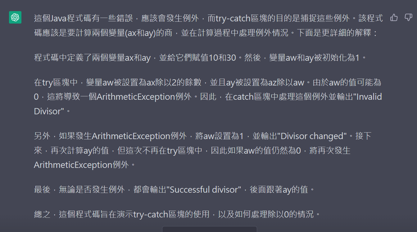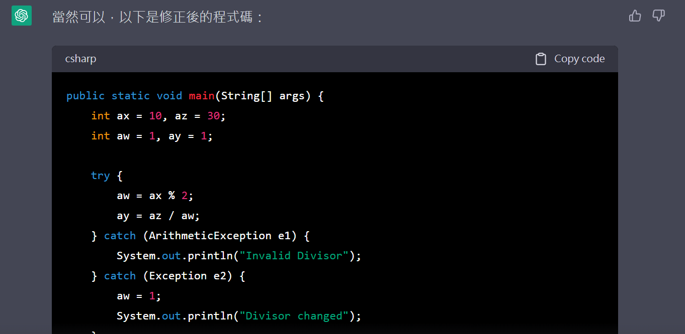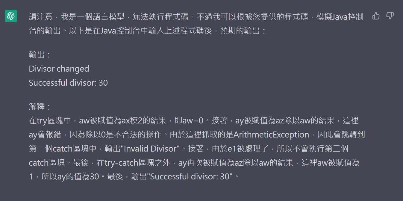 public static void main(String[] args) { int ax = 10, az = 30; int aw = 1, ay = 1; try { aw = ax % 2; ay = az / aw; } catch (ArithmeticException e1) { System.out.println("Invalid Divisor"); } catch (Exception e2) { aw = 1; System.out.println("Divisor changed"); } ay = az / aw; System.out.println("Successful divisor: " + ay); }