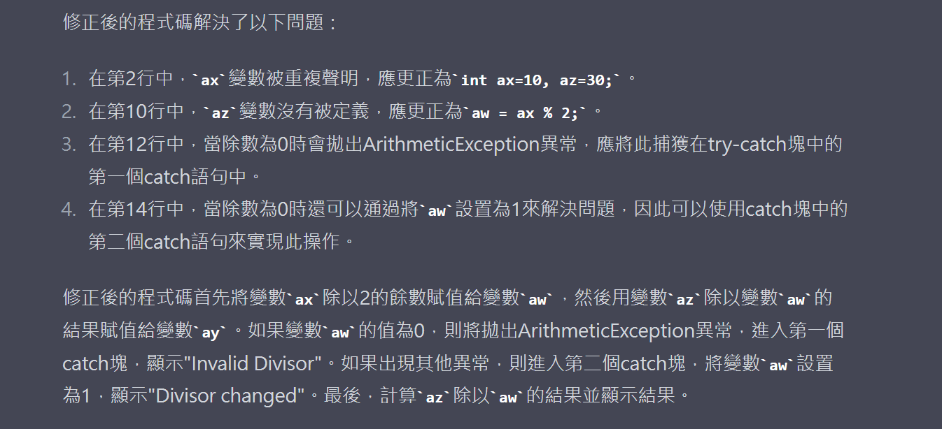 public static viod main (String[] args){ int ax=10, ax=30; int aw=1, ay=1; try { aw=ax%2; ay=az/aw; } catch(ArithmeticException e1) { System.out.println("Invalid Divisor") ; } catch(ArithmeticException e2) { aw=1; System.out.println("Divisor changed") ; } ay=az/aw; System.out.println("Successful divisor"+ay); }