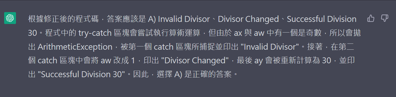 /* What is the result? A) Invalid Divisor Divisor Changed Successful Division 30 B) Invalid Divisor Successful Division 30 C) Invalid Divisor Exception in thread "main" java.lang.ArithmeticException:/by zero at java_Exception.ex3_exception.main(ex3_exception.java:28) D) Invalid Divisor */