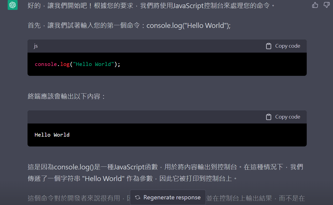 我的第一個命令是console.log (“ Hello World” );