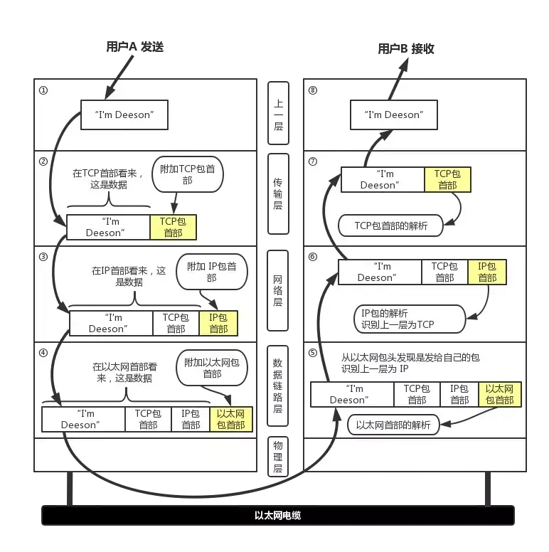 每个分层中,都会对所发送的数据附加一个首部,在这个首部中包含了该层必要的信息,如发送的目标地址以及协议相关信息。通常,为协议提供的信息为包首部,所要发送的内容为数据。在下一层的角度看,从上一层收到的包全部都被认为是本层的数据。