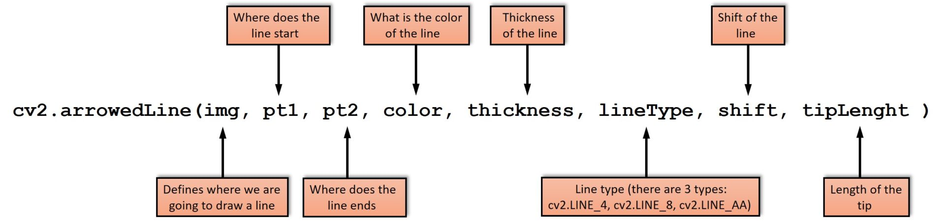 cv2.arrowedLine(img, (100,100), (400,100), (0,0,255), (10), 8,0,0.1)