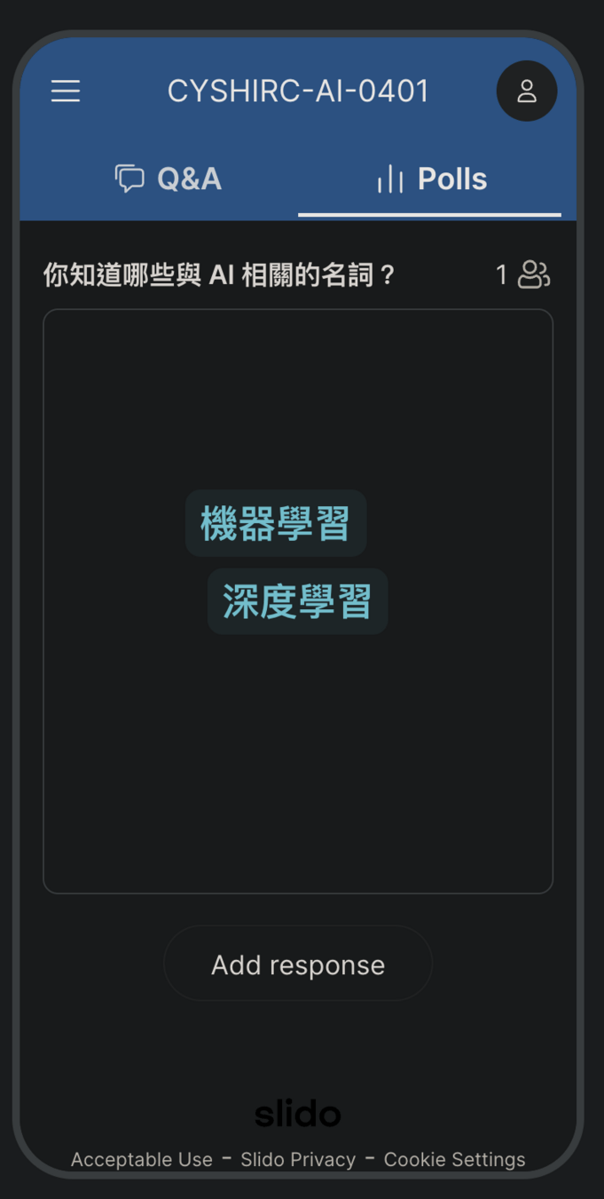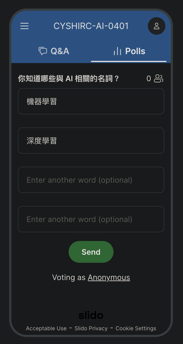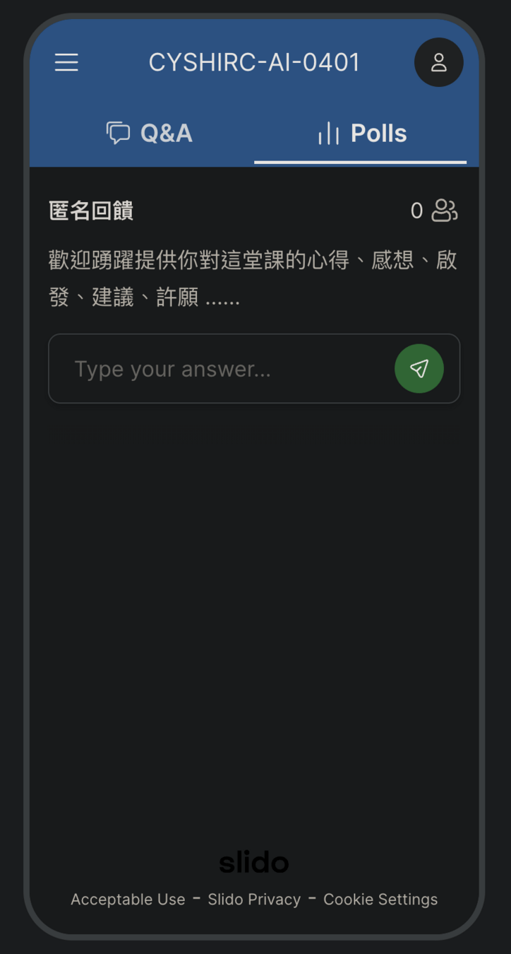 - 有任何疑問可以隨時 🙋🏻♂️ 提問,若害羞的話可以用 Slido