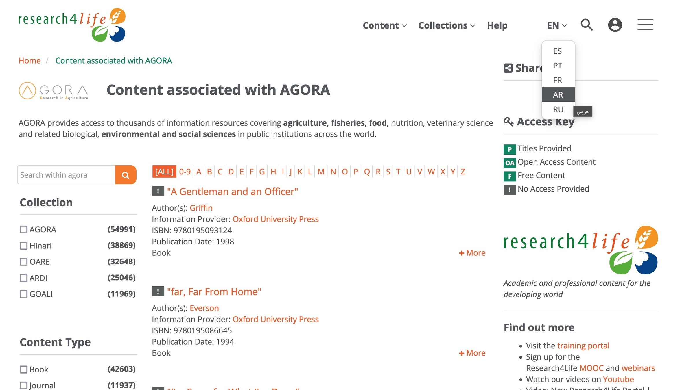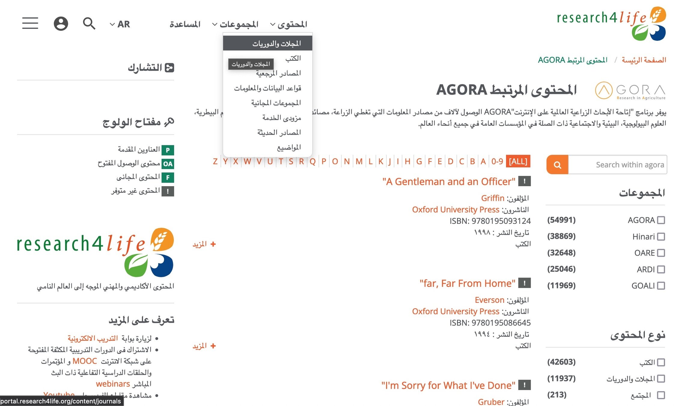 Food and Agriculture Organization of the United Nations. (n.d.). AGORA: Access to Global Online Research in Agriculture. FAO. https://www.fao.org/agora/ar