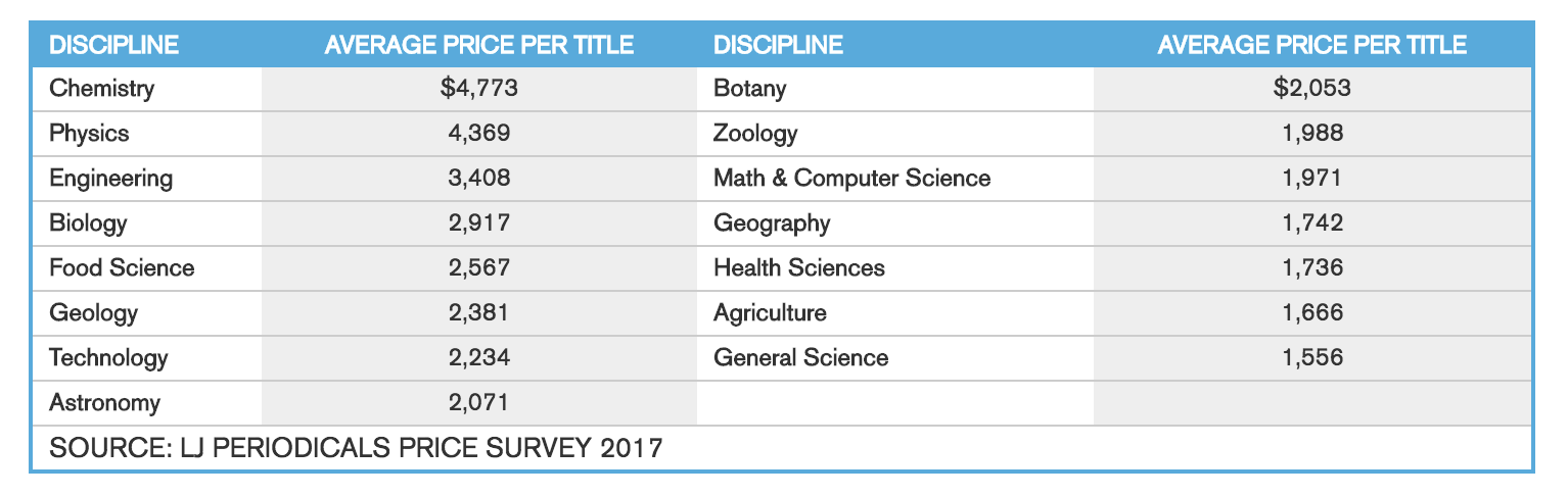 Based on LJ Periodicals Price Survey 2017 https://www.libraryjournal.com/?detailStory=new-world-same-model-periodicals-price-survey-2017
