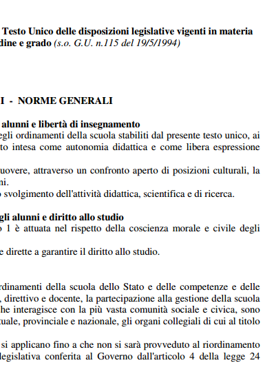 Il testo unico in materia di istruzione contiene le norme che riguardano la funzione, gli organi interni e provinciali, disposizioni per le scuole di ogni ordine e grado.
