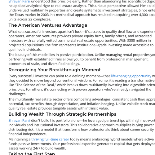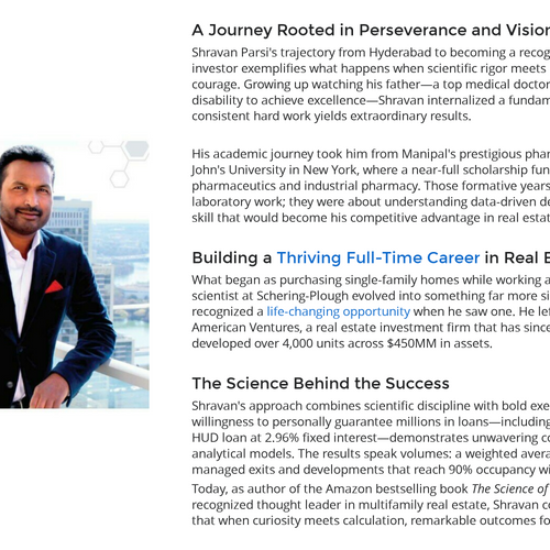 Shravan Parsi, CEO of American Ventures, blends science and business. From developing drugs to building $450MM in real estate assets, he is also the author of the Amazon Bestseller The Science of the Deal.