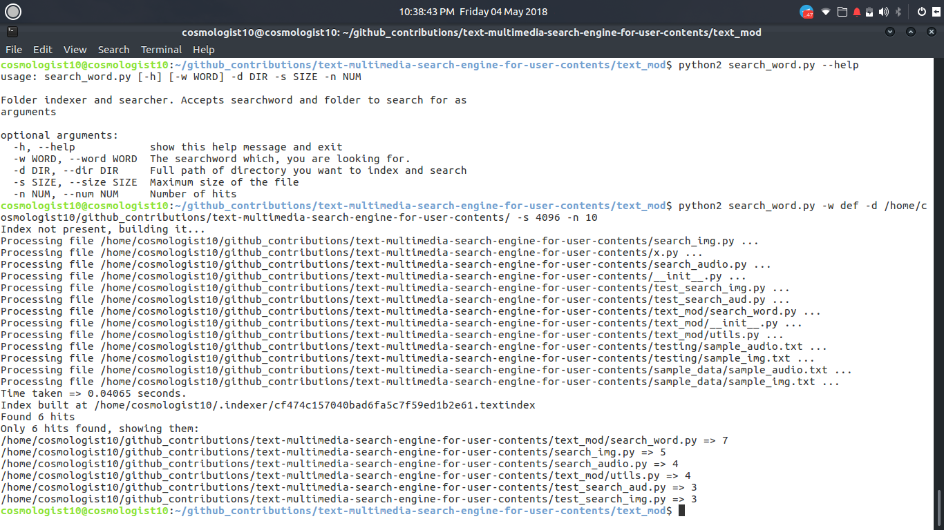 Text and Multimedia Search Engine is a project implemented in Python. This project is divided into two parts. Text Search Engine is focused to search for a word or set of words in a file system using efficient algorithms. Multimedia Search Engine is focused to search for Audio, Video and Image files by the processing of the meta data available with the files. This project is envisioned to be packaged as a Python library.