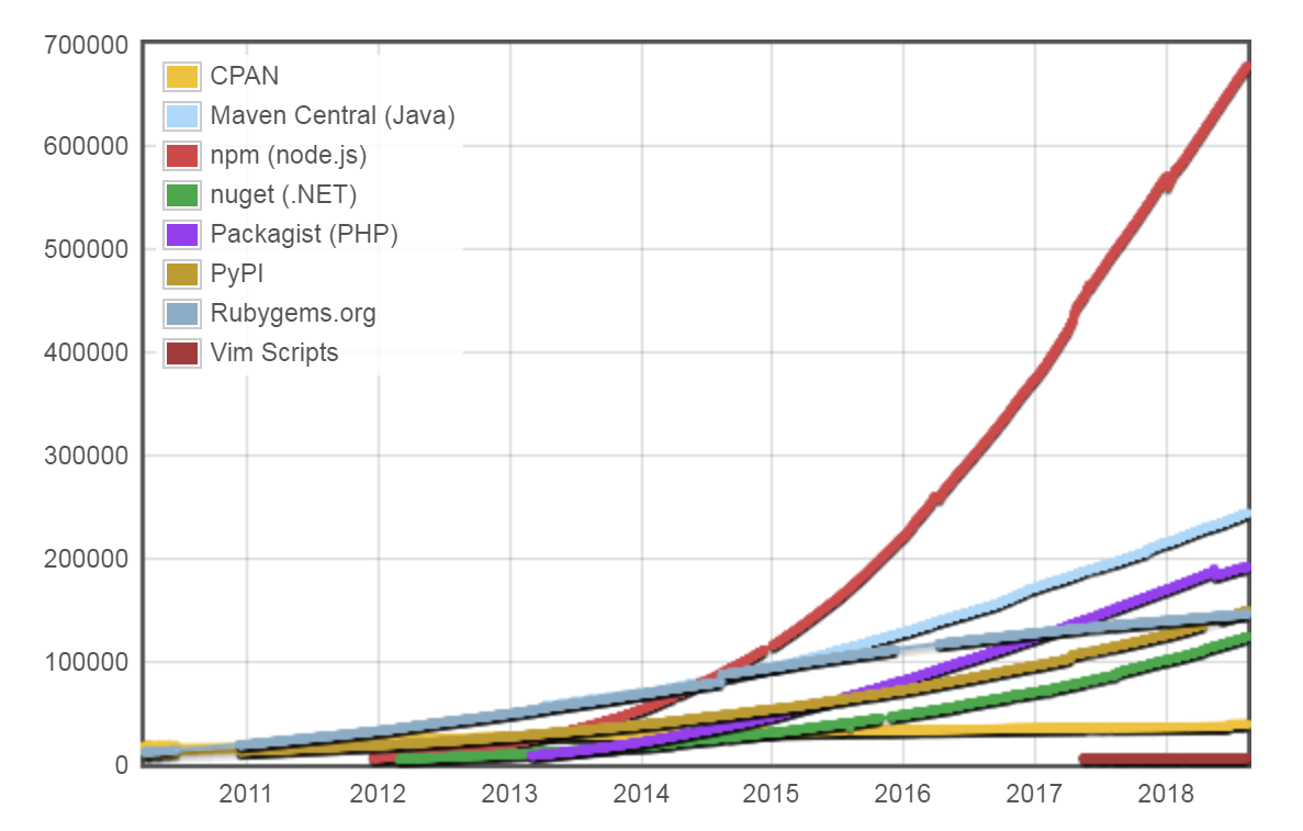Статистика по количеству пакетов в разных хранилищах, начиная с 2010 года