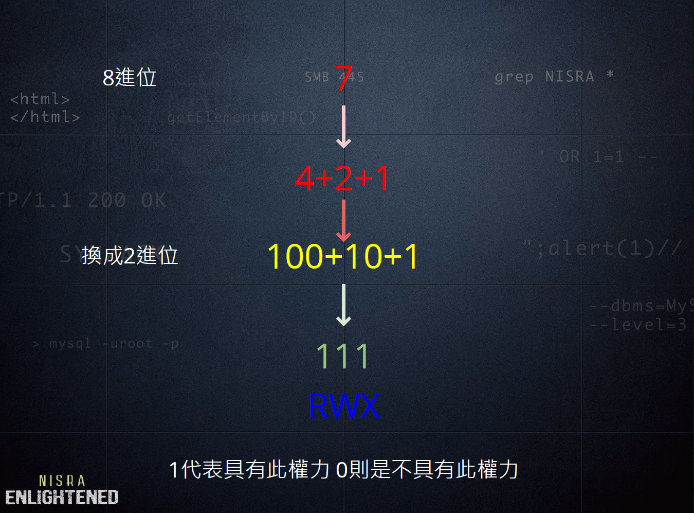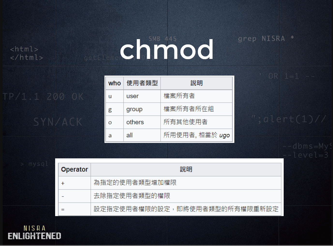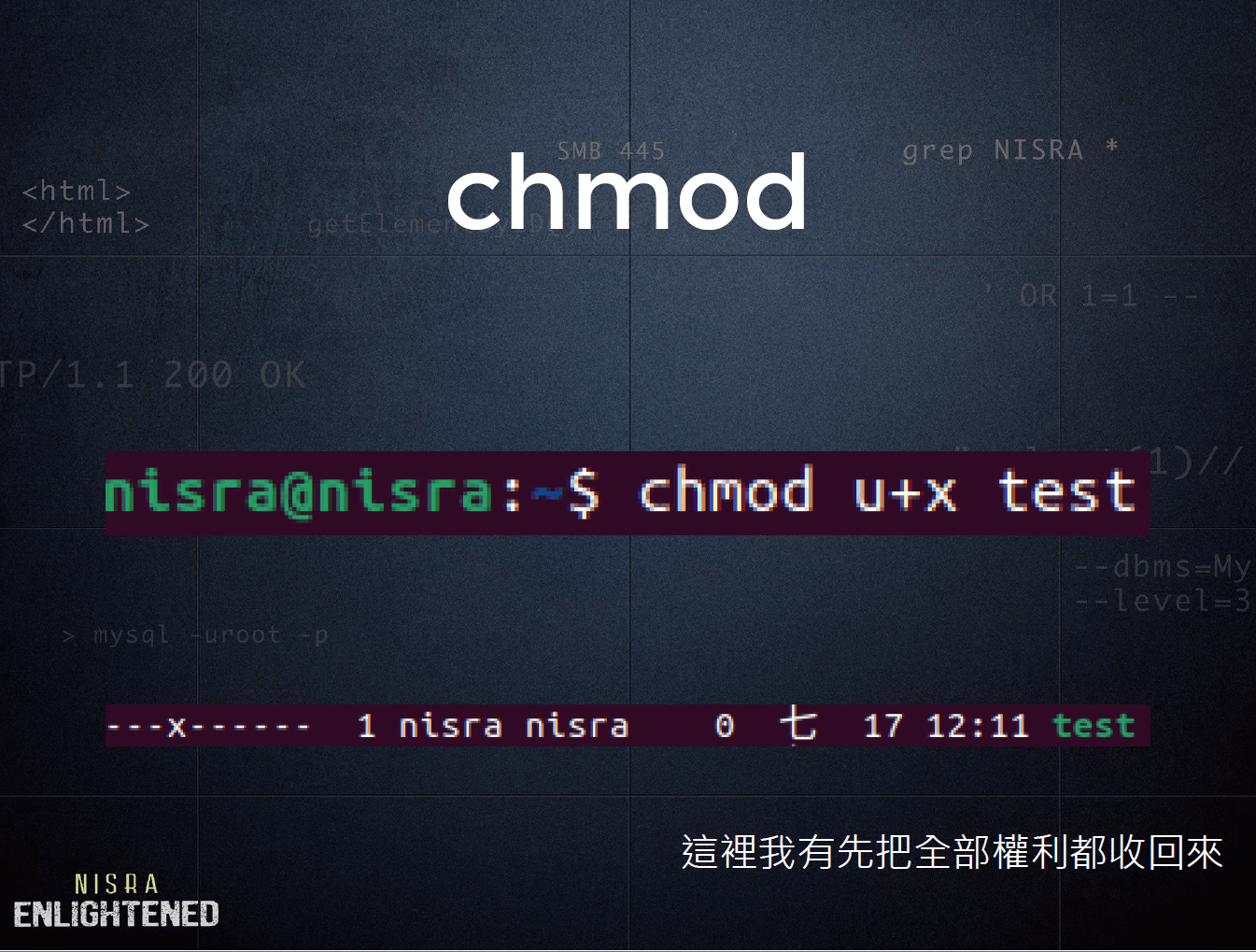 - $ chmod <權限> <檔案(目錄)>