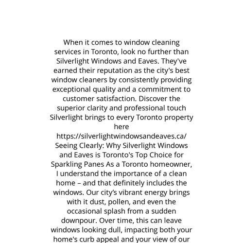 Website: https://silverlightwindowsandeaves.ca/ When it comes to window cleaning services in Toronto, look no further than Silverlight Windows and Eaves. They've earned their reputation as the city's best window cleaners by consistently providing exc
