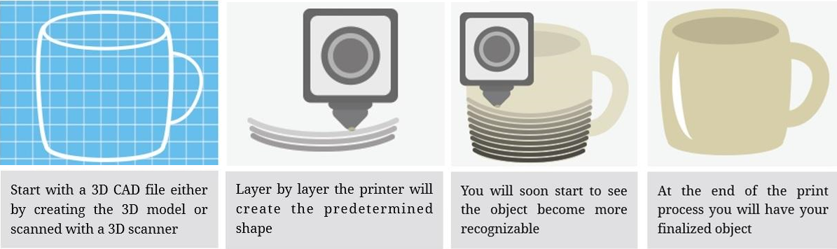 Una impresión 3D, es un proceso de Fabricación Aditivo, por medio del cual se crean objetos, a través el depósito de capas de material unas sobre otras.
