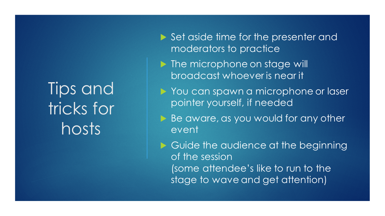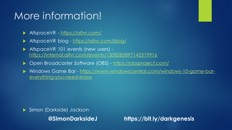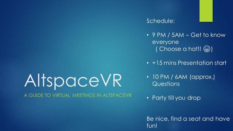 An in-depth overview of the AltspaceVR service and what it takes to run a successful event in their virtual world A virtual chat following on from my overview guide here: https://darkgenesis.zenithmoon.com/running-an-event-in-altspacevr-an-end-to-end-guide/