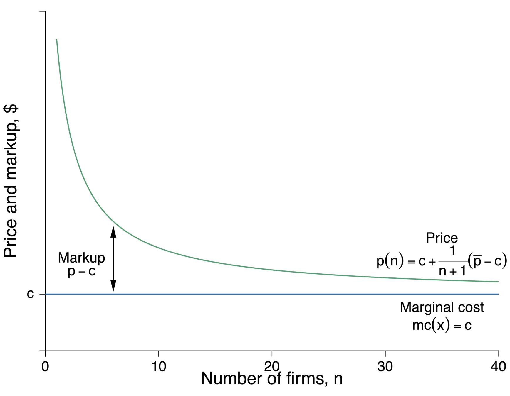 As n increases, markup (and markup ratio) decrease. (Cournot’s “unlimited competition”)