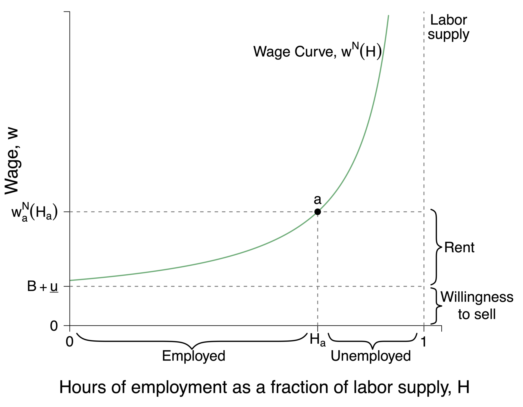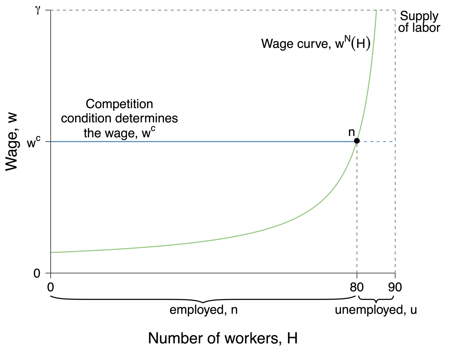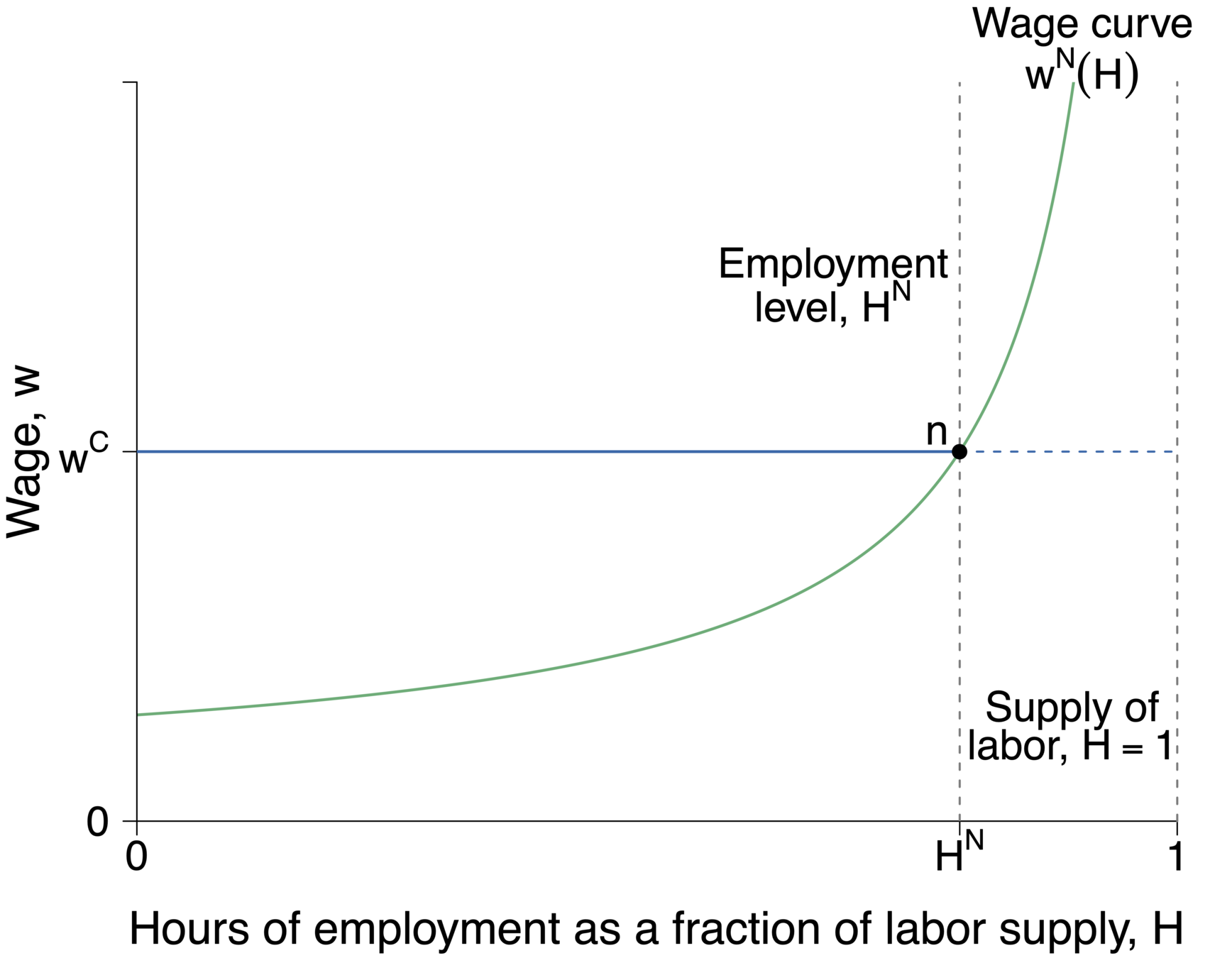 Point n indicates the Nash equilibrium wage and employment levels, from which the level of profits and unemployment, $$1 -H^N$$