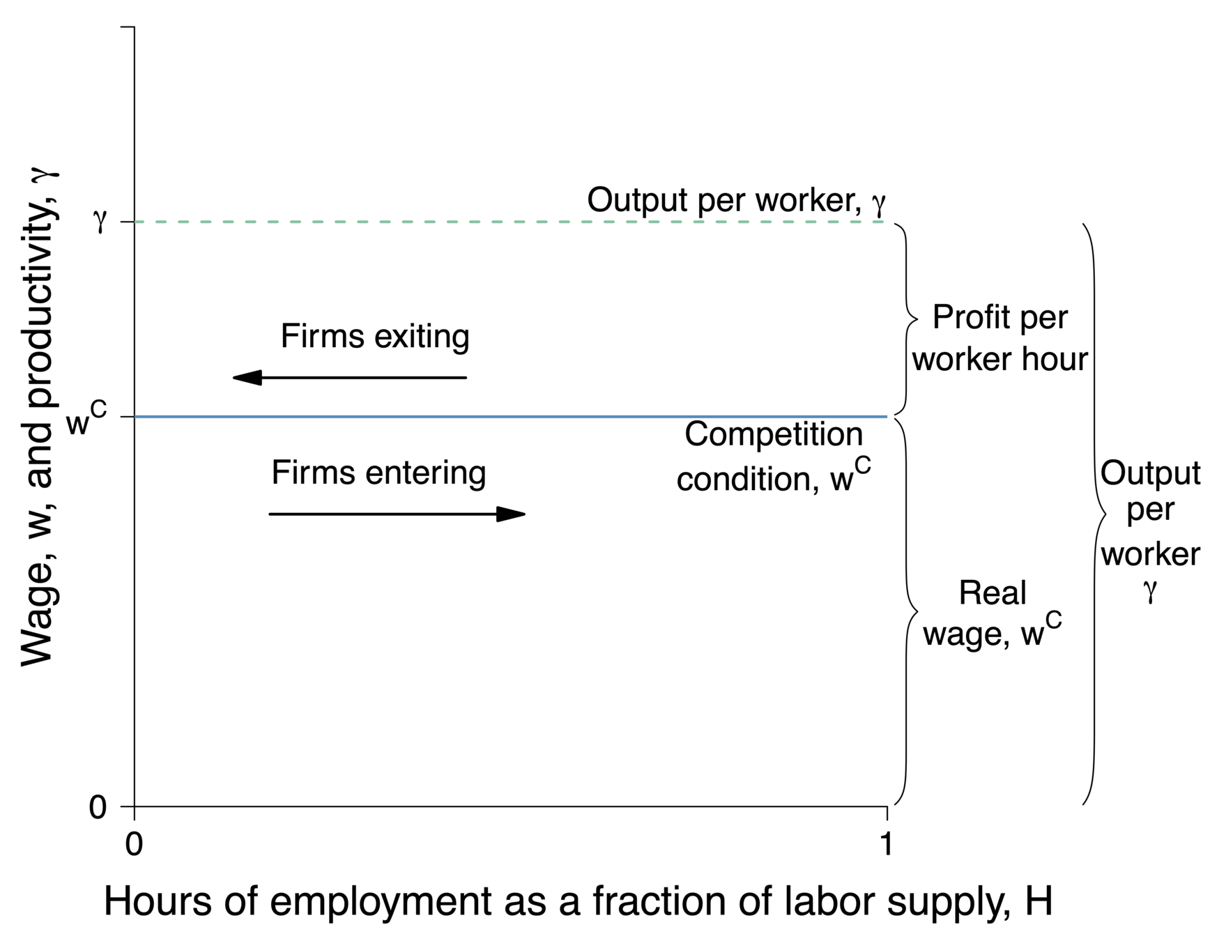 Given the extent of barriers to entry, output per worker hour, and the opportunity cost of capital, the real wage indicated by the competition condition divides the output per worker between wages and profits in such a way that the number of firms does not change.