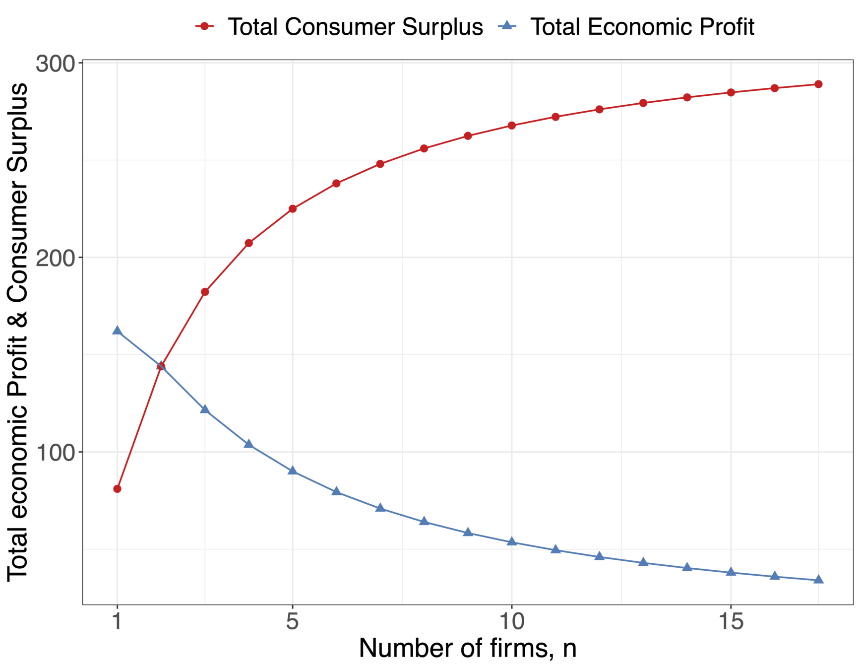 Firms' economic profits decrease with the number of firms (profit per unit decreases as p decreases)