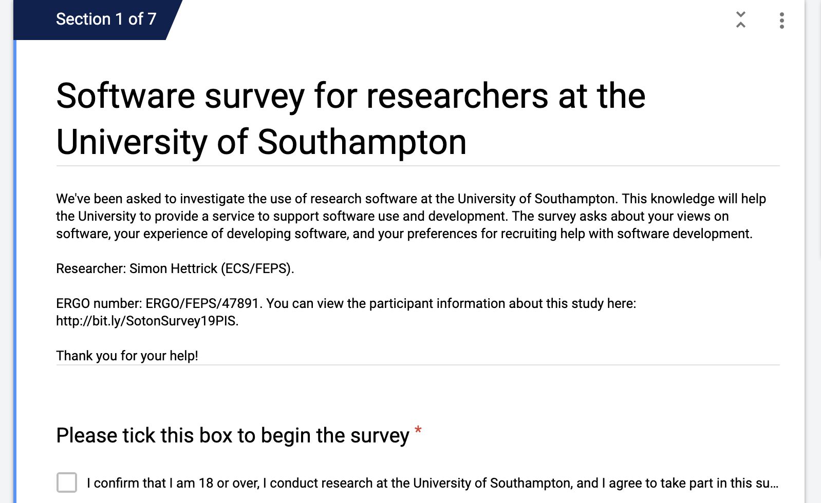 Southampton Research Software Community, 17 July 2019, Southampton. Presentation on the results of the University of Southampton software survey conducted in June 2019. These slides were not presented. They were used to allow people to access the results of the survey.