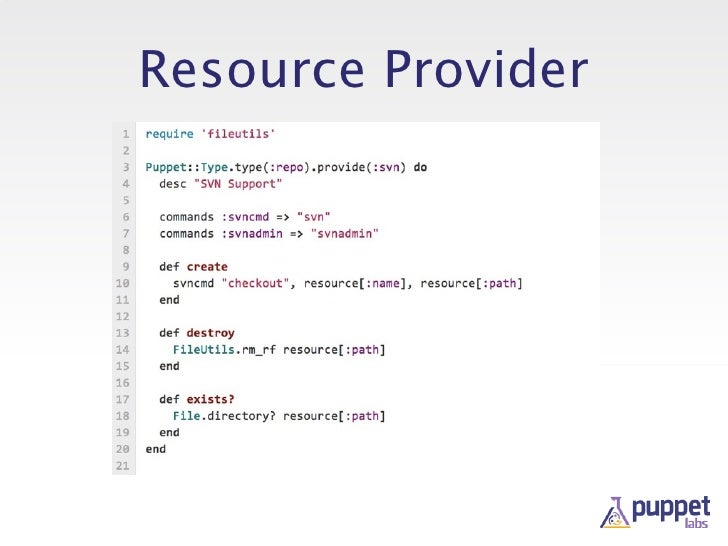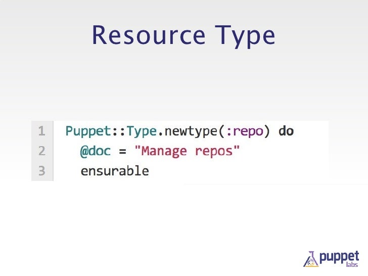 class modulename::classname { package{'package_name':} -> file{'/etc/filename':} ~> service{'service_name':} }define modulename::definename( $parameter_one = 'default_value', ) { file{"/etc/$parameter_one"} }