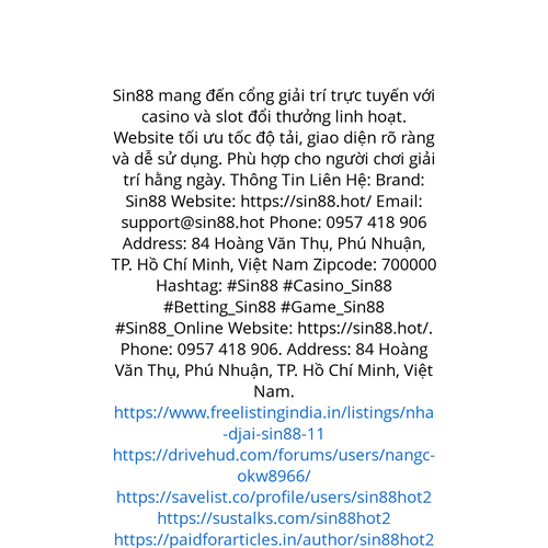 Website: https://sin88.hot/. Sin88 mang đến cổng giải trí trực tuyến với casino và slot đổi thưởng linh hoạt. Website tối ưu tốc độ tải, giao diện rõ ràng và dễ sử dụng. Phù hợp cho người chơi giải trí hằng ngày. Thông Tin Liên Hệ: Brand: Sin88 Webs