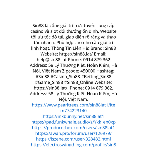 Website: https://sin88.lat/. Sin88 là cổng giải trí trực tuyến cung cấp casino và slot đổi thưởng ổn định. Website tối ưu tốc độ tải, giao diện rõ ràng và thao tác nhanh. Phù hợp cho nhu cầu giải trí linh hoạt. Thông Tin Liên Hệ: Brand: Sin88 Websit