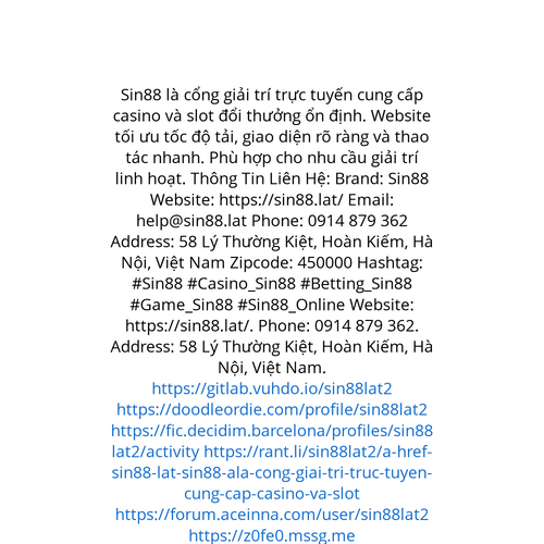 Website: https://sin88.lat/. Sin88 là cổng giải trí trực tuyến cung cấp casino và slot đổi thưởng ổn định. Website tối ưu tốc độ tải, giao diện rõ ràng và thao tác nhanh. Phù hợp cho nhu cầu giải trí linh hoạt. Thông Tin Liên Hệ: Brand: Sin88 Websit
