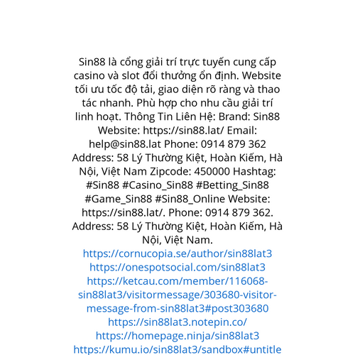 Website: https://sin88.lat/. Sin88 là cổng giải trí trực tuyến cung cấp casino và slot đổi thưởng ổn định. Website tối ưu tốc độ tải, giao diện rõ ràng và thao tác nhanh. Phù hợp cho nhu cầu giải trí linh hoạt. Thông Tin Liên Hệ: Brand: Sin88 Websit