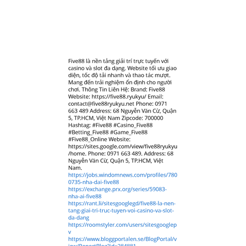 Website: https://sites.google.com/view/five88ryukyu/home. Five88 là nền tảng giải trí trực tuyến với casino và slot đa dạng. Website tối ưu giao diện, tốc độ tải nhanh và thao tác mượt. Mang đến trải nghiệm ổn định cho người chơi. Thông Tin Liên Hệ: