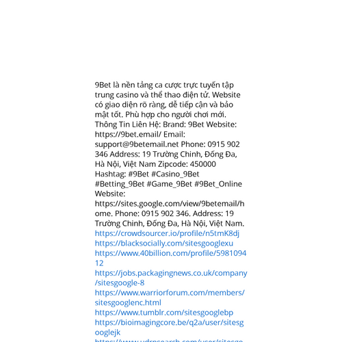 Website: https://sites.google.com/view/9betemail/home. 9Bet là nền tảng ca cược trực tuyến tập trung casino và thể thao điện tử. Website có giao diện rõ ràng, dễ tiếp cận và bảo mật tốt. Phù hợp cho người chơi mới. Thông Tin Liên Hệ: Brand: 9Bet Web