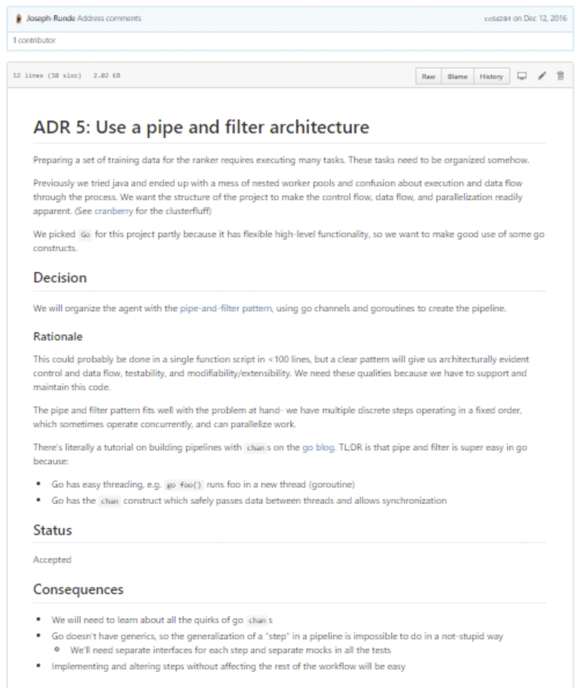 “An architecture decision record is a short text file in a format similar to an Alexandrian pattern that describes a set of forces and a single decision in response to those forces.”