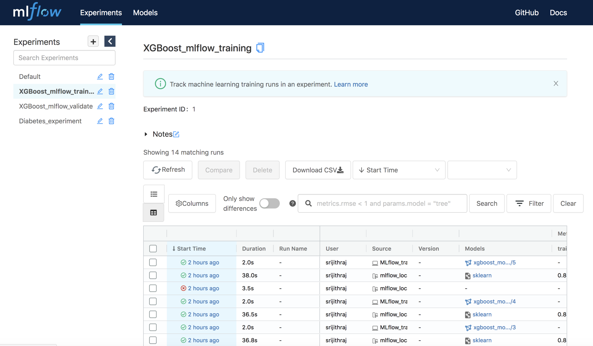 result=mlflow.register_model('runs:/314035cfab2245d5ad266b84751dff8a/model', "XGBoost_sr")Can also register the model from a run