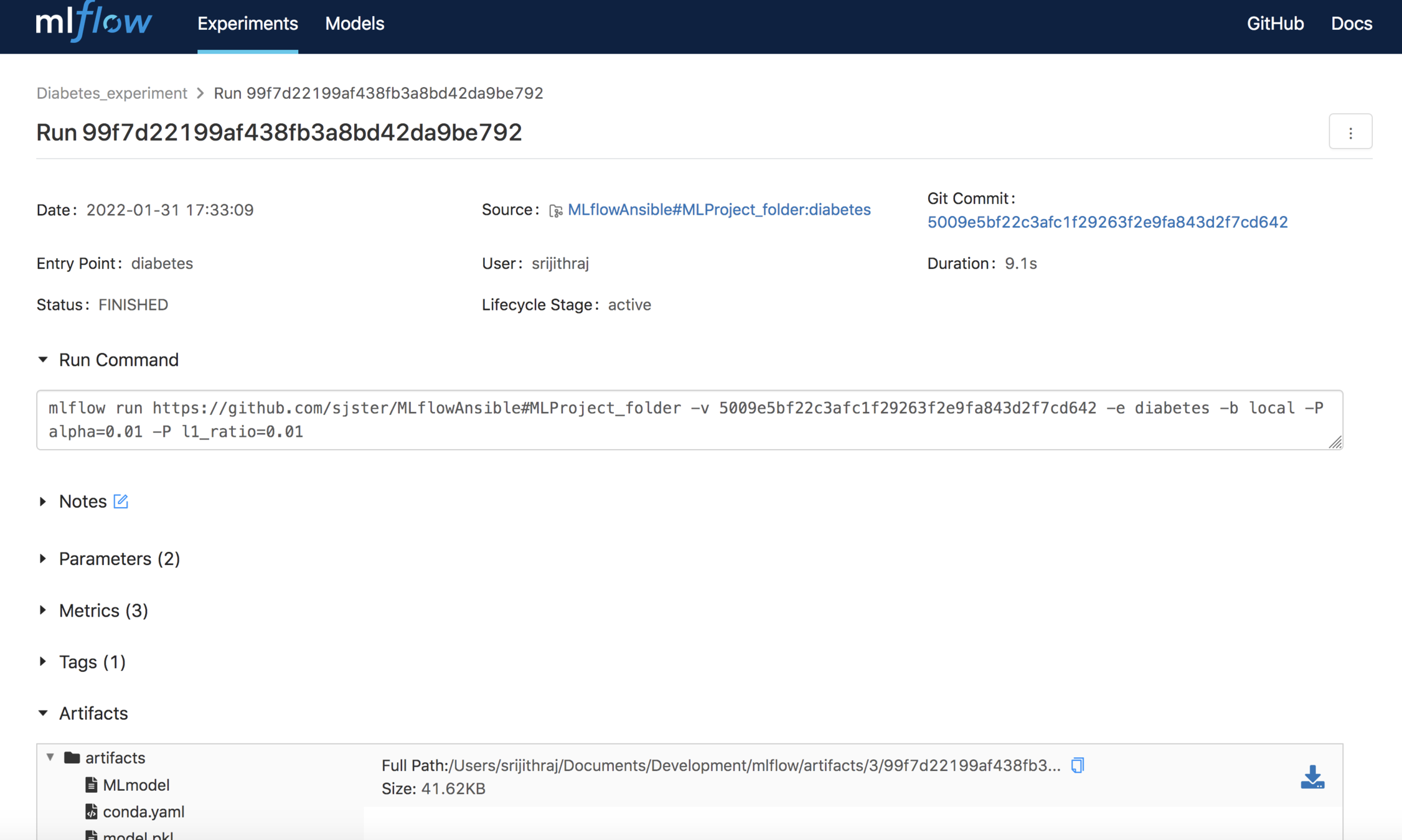 - Experiment runs save metrics, parameters, artifacts (output files, images etc.)
