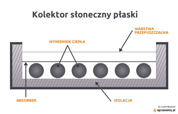 Absorbują promienie słoneczne poprzez ciemną powłokę zwaną absorberem. Do jej dolnej części przylutowane są miedziane/aluminiowe kanały przepływowe dla płynu grzewczego. Poprzez wężownice w zbiorniku wody, płyn solarny przekazuje ciepło podgrzewając ją. Absorber zbudowany jest z blachy pokrytej warstwą absorbującą, od której zależy przede wszystkim trwałość i wysoka sprawność sprzętu. Pod absorberem kolektor izolowany jest wełną mineralną, od góry przykryty szybą solarną, odporną na grad itp. Całość zamknięta jest w estetycznej obudowie aluminiowej.