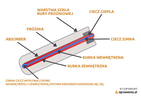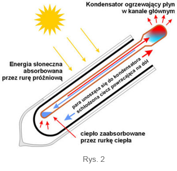 Miedziane rurki ciepła w kolektorze są fabrycznie napełnione cieczą o niskiej temperaturze parowania. Podczas ogrzewania rur przez słońce zaczyna ona parować i ciepło przechodzi do końcówki rury kondensatora umiejscowionej w kanale zbiorczym będącym wymiennikiem ciepła. Poprzez kondensator ciepło oddawane jest najpierw do płynu przepływającego przez kanał zbiorczy a potem przekazywane do zbiornika ciepłej wody.