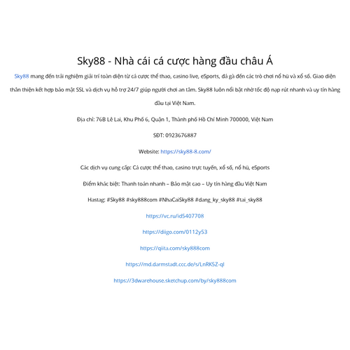 Sky88 là nhà cái cá cược trực tuyến uy tín hàng đầu Việt Nam, chuyên cung cấp các dịch vụ thể thao, casino, eSports với tỷ lệ kèo cao và khuyến mãi hấp dẫn. Website: https://sky88-8.com/