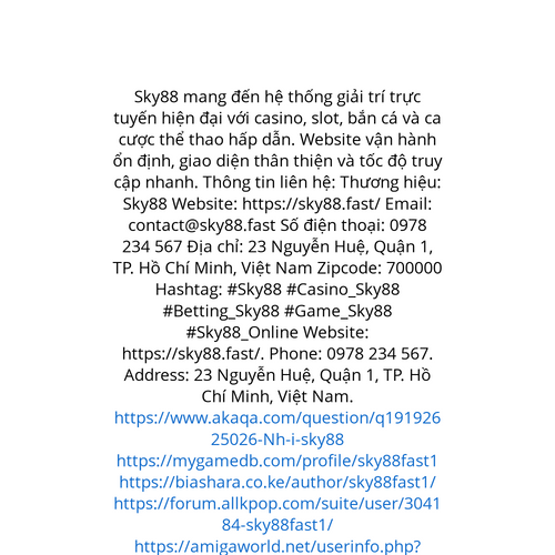 Website: https://sky88.fast/. Sky88 mang đến hệ thống giải trí trực tuyến hiện đại với casino, slot, bắn cá và ca cược thể thao hấp dẫn. Website vận hành ổn định, giao diện thân thiện và tốc độ truy cập nhanh. Thông tin liên hệ: Thương hiệu: Sky88 W