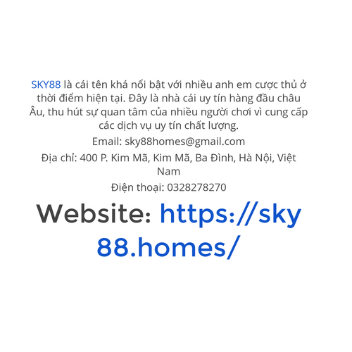 SKY88 là cái tên khá nổi bật với nhiều anh em cược thủ ở thời điểm hiện tại. Đây là nhà cái uy tín hàng đầu châu Âu, thu hút sự quan tâm của nhiều người chơi vì cung cấp các dịch vụ uy tín chất lượng. Email: sky88homes@gmail.com Địa chỉ: 400 P. Kim Mã, Kim Mã, Ba Đình, Hà Nội, Việt Nam Điện thoại: 0328278270 Website: https://sky88.homes/
