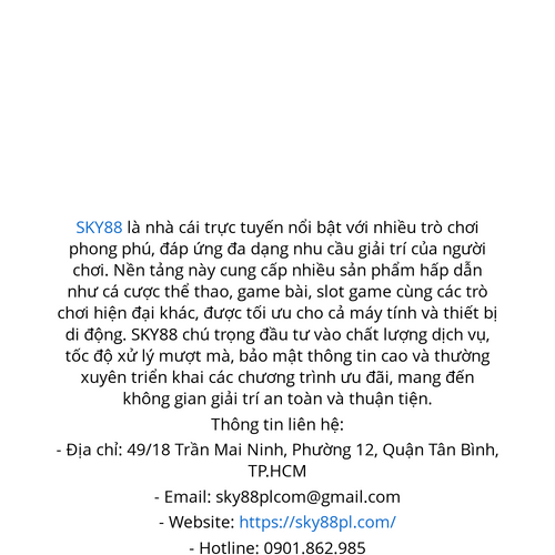 SKY88 là nhà cái trực tuyến nổi bật với nhiều trò chơi phong phú, đáp ứng đa dạng nhu cầu giải trí của người chơi. - Website: https://sky88pl.com/