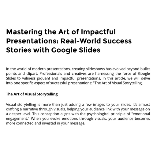These success stories highlighting the effectiveness of visual storytelling, demonstrating how a well-crafted slide can transform a presentation into an engaging and memorable experience.