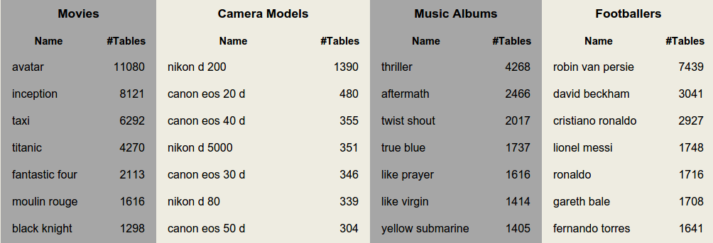 Google's Sets => WDC Web Tables