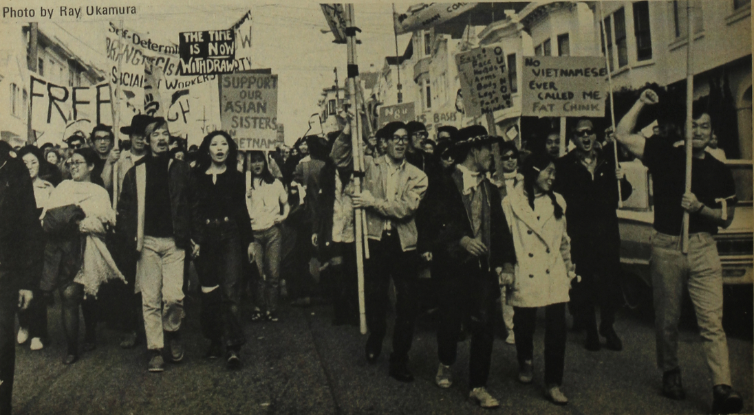 Anti-War Rally in San Francisco, 1969, by Ray Okamura. Originally published in Gidra, via Densho Encyclopedia.