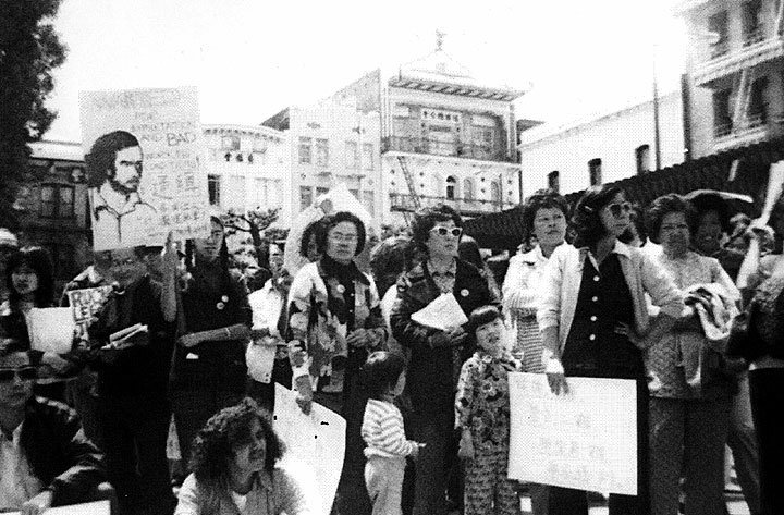 135 Strikers From The Chinatown Jung Sai Garment Factory Rallied at Portsmouth Square in 1974, unknown photographer. Via Found SF..