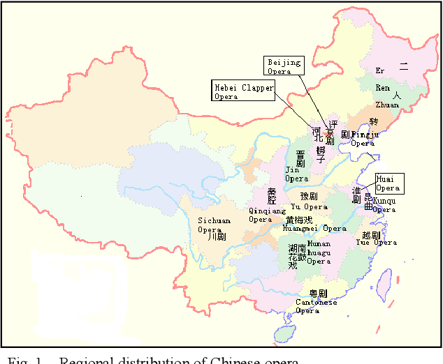 There are hundreds of operatic traditions in China. The map on the right shows some of the most prominent traditions and the approximate locations where they developed.