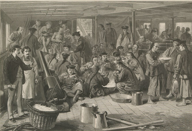 Chinese Emigration to America: Sketch on Board the Steam-Ship Alaska, Bound for San Francisco, unknown artist. Public Domain {{PD-US}}, via Hong Kong Baptist University Library Art Collections.