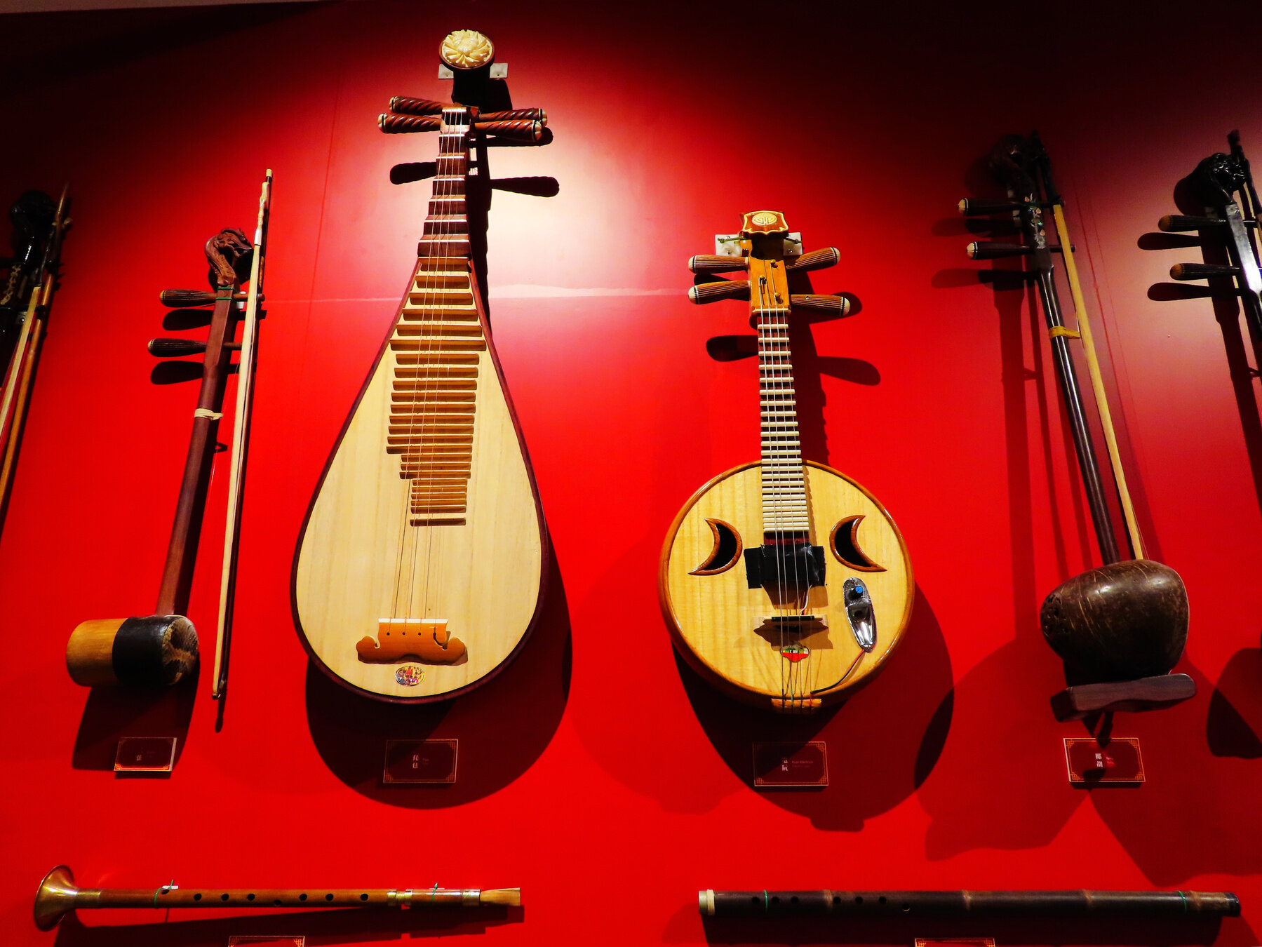 Some of the melodic instruments (bowed, plucked and wind) used in Cantonese opera. In recent decades, operatic ensembles often include a few Western instruments, such as violin and saxophone.