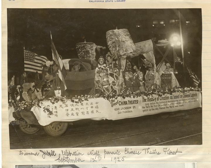 Many non-Chinese Americans were introduced to Cantonese opera through parades. On the right, you see the elaborate Great China Theater float at the 1925 California Diamond Jubilee Celebration.
