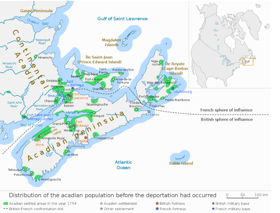 In 1755, the British (Protestant) forcibly exiled the French-speaking (Catholic) Acadian people from their homeland, in an ethnic cleansing operation now known as 'Le Grand Derangement.'