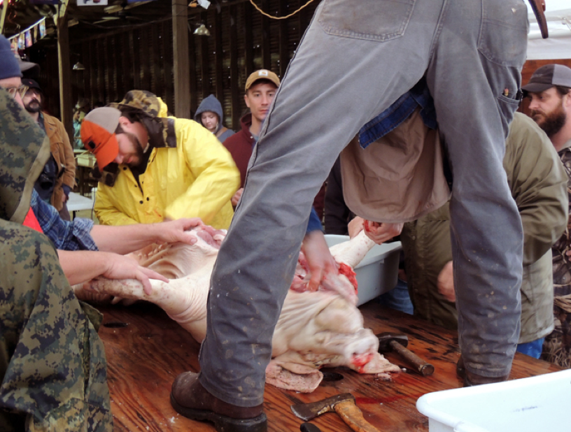 A boucherie is an all-day event that involves killing, butchering, cooking, and eating a pig.