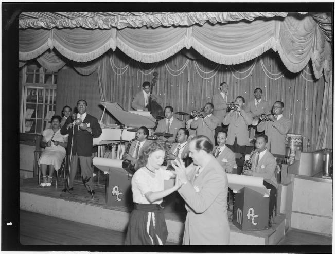 Above: Exito! Celebrando 2016 - Salsa & Heritage Festival!, by Laura Holtz. Puerto Rican Cultural Center. Left: Portrait of Machito, Graciella Grillo, and Mario Bouza, Glen Island Casino, by William P. Gottlieb. Library of Congress.